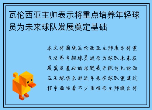 本文将围绕瓦伦西亚主帅表示将重点培养年轻球员,进而为球队未来发展奠定基础的话题展开探讨。瓦伦西亚足球俱乐部近年来在球队重建过程中面临着不少困难,而主帅提出将着眼于年轻球员的培养,无疑为球队带来了新的希望。这一策略不仅能为瓦伦西亚未来的发展奠...