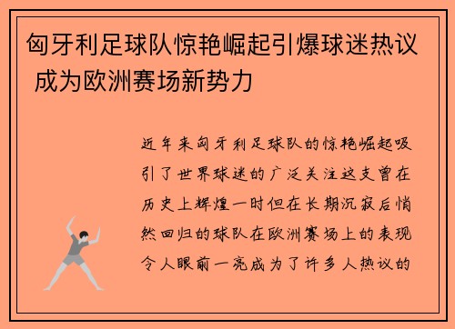 近年来,匈牙利足球队的惊艳崛起吸引了世界球迷的广泛关注。这支曾在历史上辉煌一时,但在长期沉寂后悄然回归的球队,在欧洲赛场上的表现令人眼前一亮,成为了许多人热议的焦点。匈牙利足球队以其富有活力和高效战术,逐渐成为欧洲足坛新兴的强大力量。本文将...