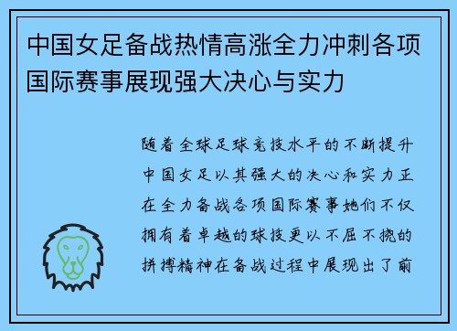 随着全球足球竞技水平的不断提升,中国女足以其强大的决心和实力,正在全力备战各项国际赛事。她们不仅拥有着卓越的球技,更以不屈不挠的拼搏精神,在备战过程中展现出了前所未有的热情和动力。本文将从四个方面详细探讨中国女足如何备战,展示其为取得佳绩所...